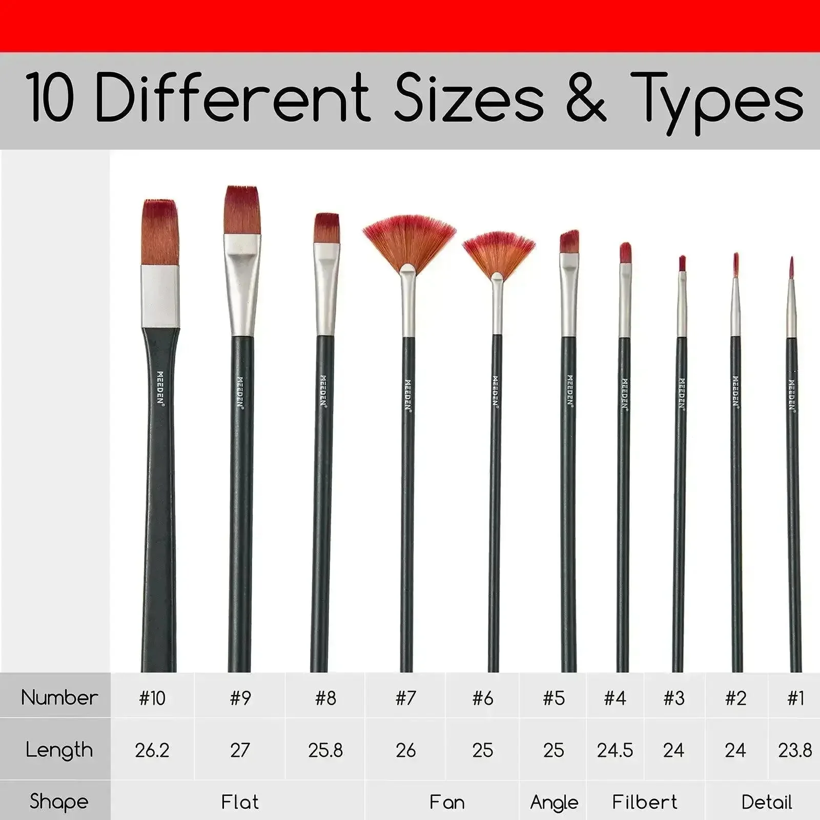 - Various Types and Sizes: The MEEDEN 10-Piece Paintbrush Set includes 10 different brushes in various sizes and types. Whether you want to add value, cover large areas, or do detailed work, this set has you covered.